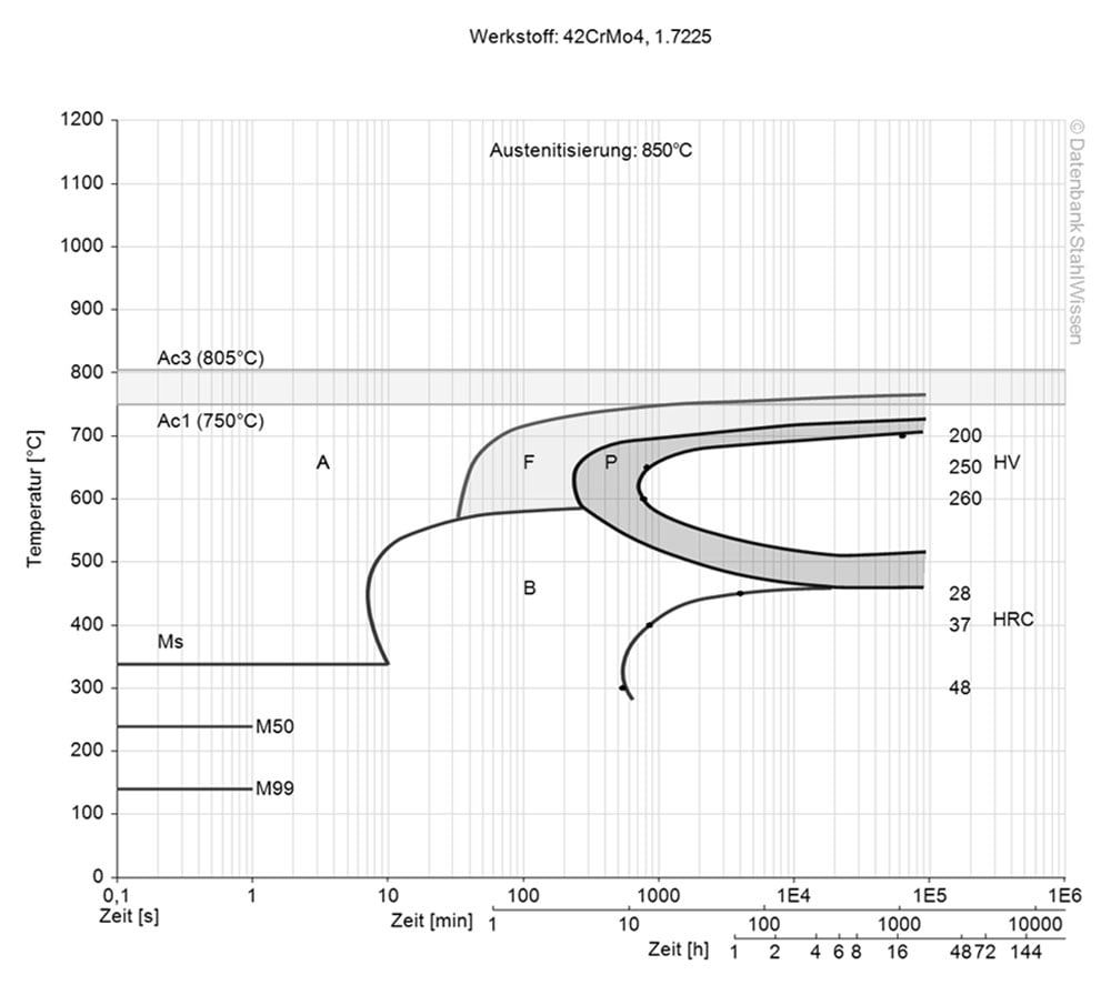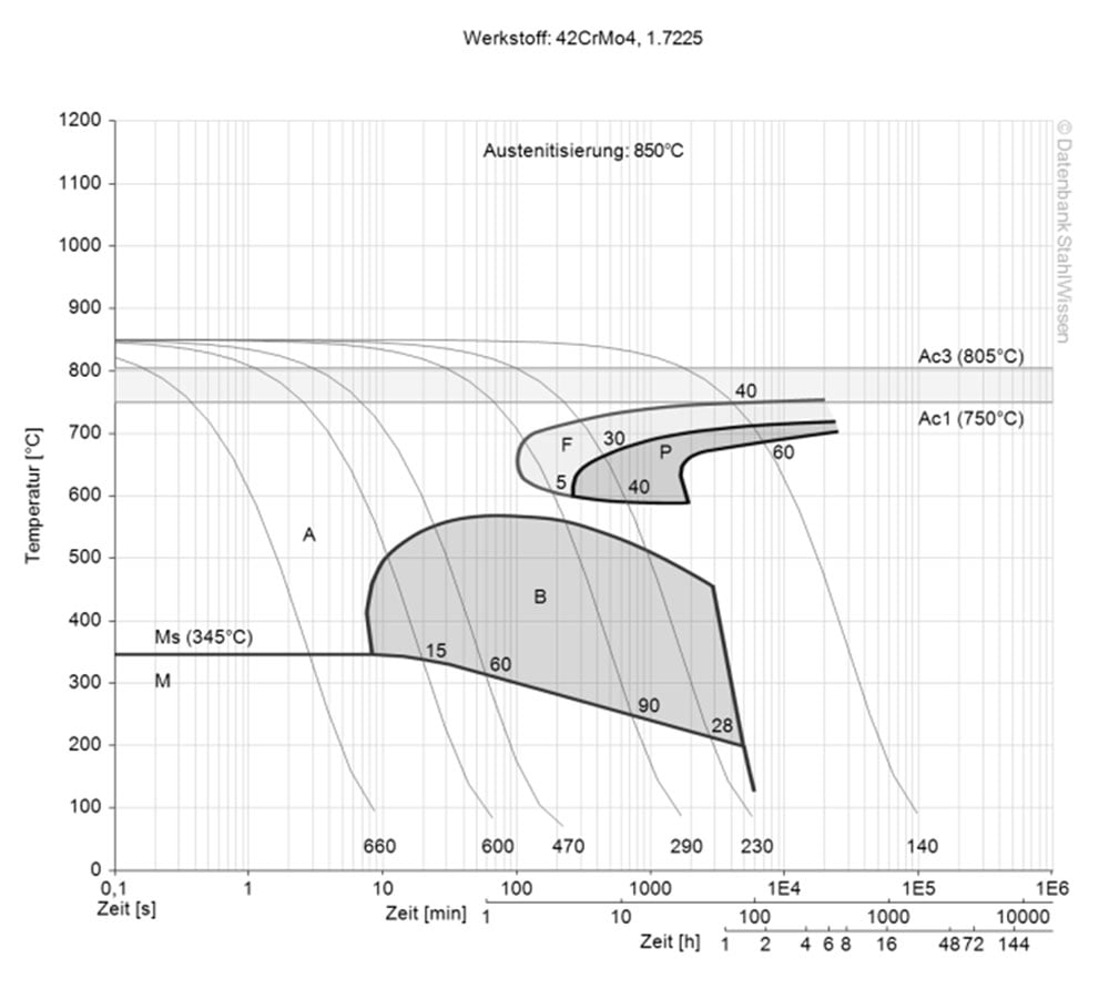 This diagram shows the structural changes at the micro level over time at a constant temperature. It shows at what temperature and after what time different phases, e.g. perlite, martensite or bainite, begin to form.
