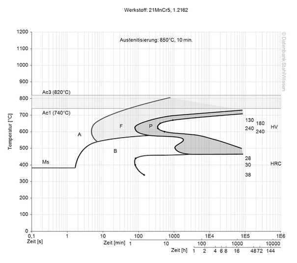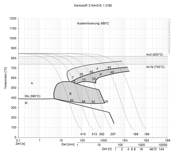 This diagram shows the structural changes at micro level over time at a constant temperatur. It shows at which temperatures after what time the different phases like perlit, martensite or bainite start to form.