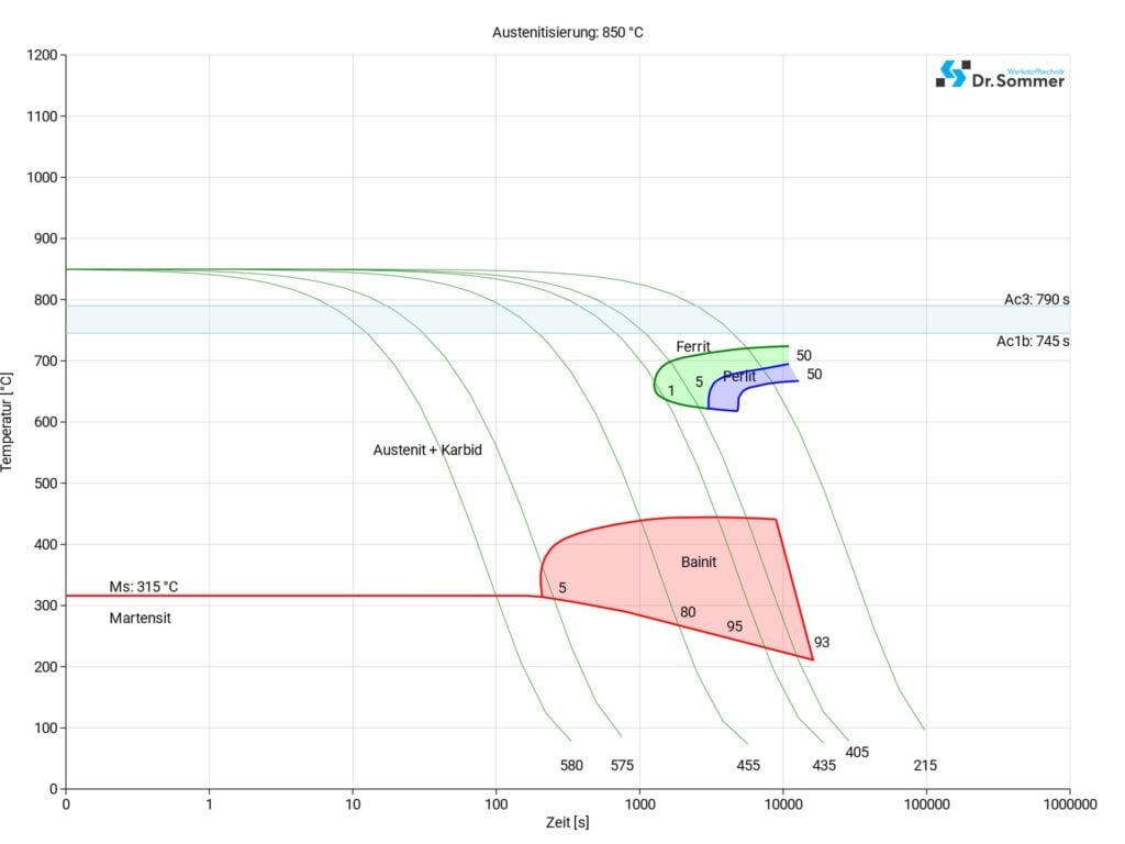 This diagram shows the structural changes at micro level over time at a constant temperatur. It shows at which temperatures after what time the different phases like perlit, martensite or bainite start to form.