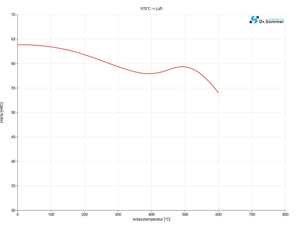 For tools that have to withstand high impacts a double tempering procedure should be done in a temperature range of 480 – 540 °C. For smaller pieces the tempering temperature should be held for a minimum of 1 hour and for lager pieces 1 hour per 25 mm thickness.