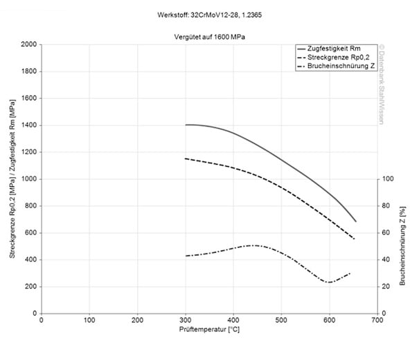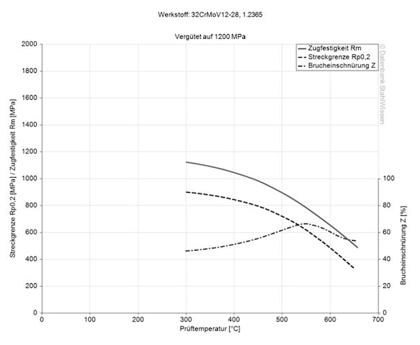 The tensile strength of tool steel 1.2365 is approx. 770 N/mm2. This value is the result of a tensile test that shows how much force is required to cause the material to stretch or deform before it breaks.