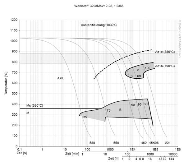 This diagram shows the structural changes at the micro level over time at a constant temperature. It shows at what temperature and after what time different phases, e.g. perlite, martensite or bainite, begin to form.