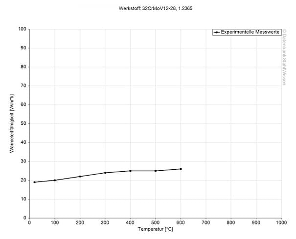 The following table shows the heat conductivity for tool steel 1.2365 at various temperatures.