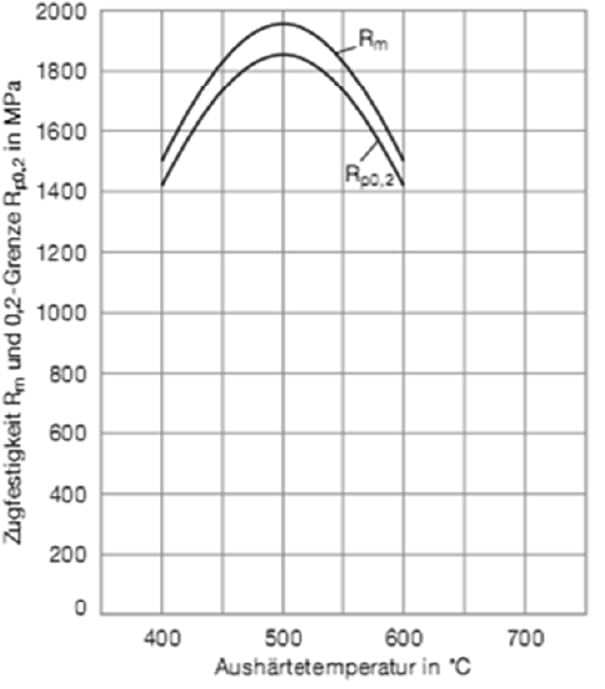 To achieve a strength of 1860 – 2260 N/mm2, the material is heated evenly to a temperature of 480°C, held for 3 hours and then cooled in air.
