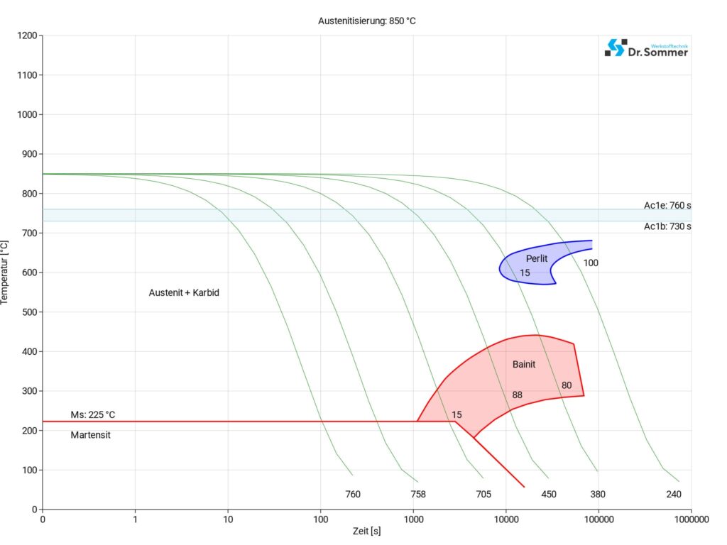 This diagram shows the structural changes at the micro level over time at a constant temperature. It shows at what temperature and after what time different phases, e.g. perlite, martensite or bainite, begin to form.