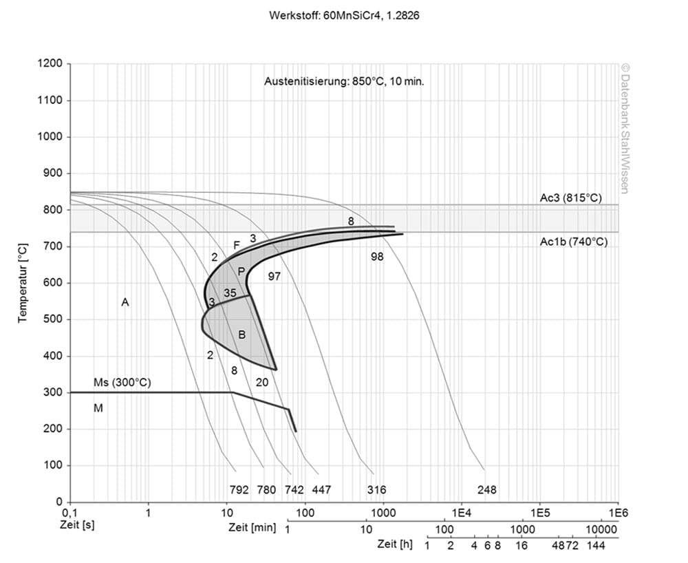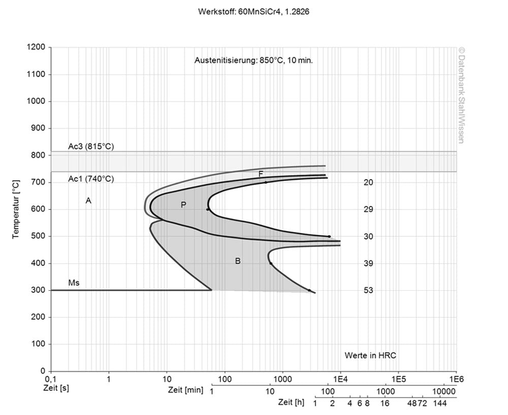 This diagram shows the structural changes at micro level over time at a constant temperatur. It shows at which temperatures after what time the different phases like perlit, martensite or bainite start to form.