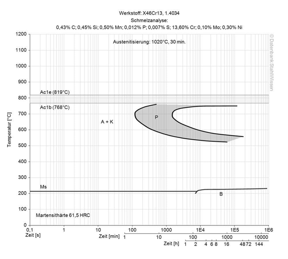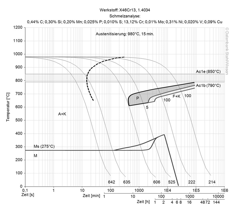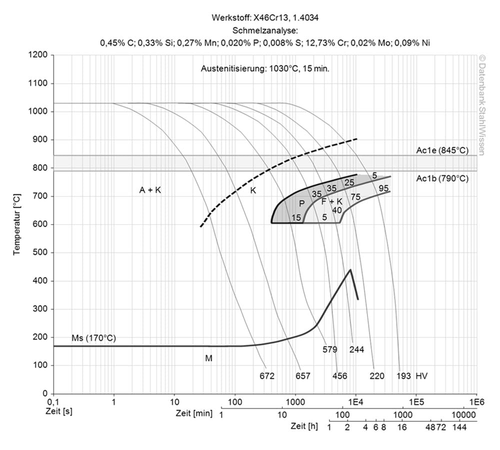 This diagram shows micro-changes over time at different temperatures. These are important in heat treatment because they provide information about the optimal conditions for processes such as hardening, annealing and normalising.