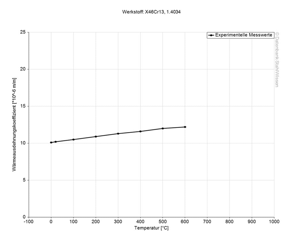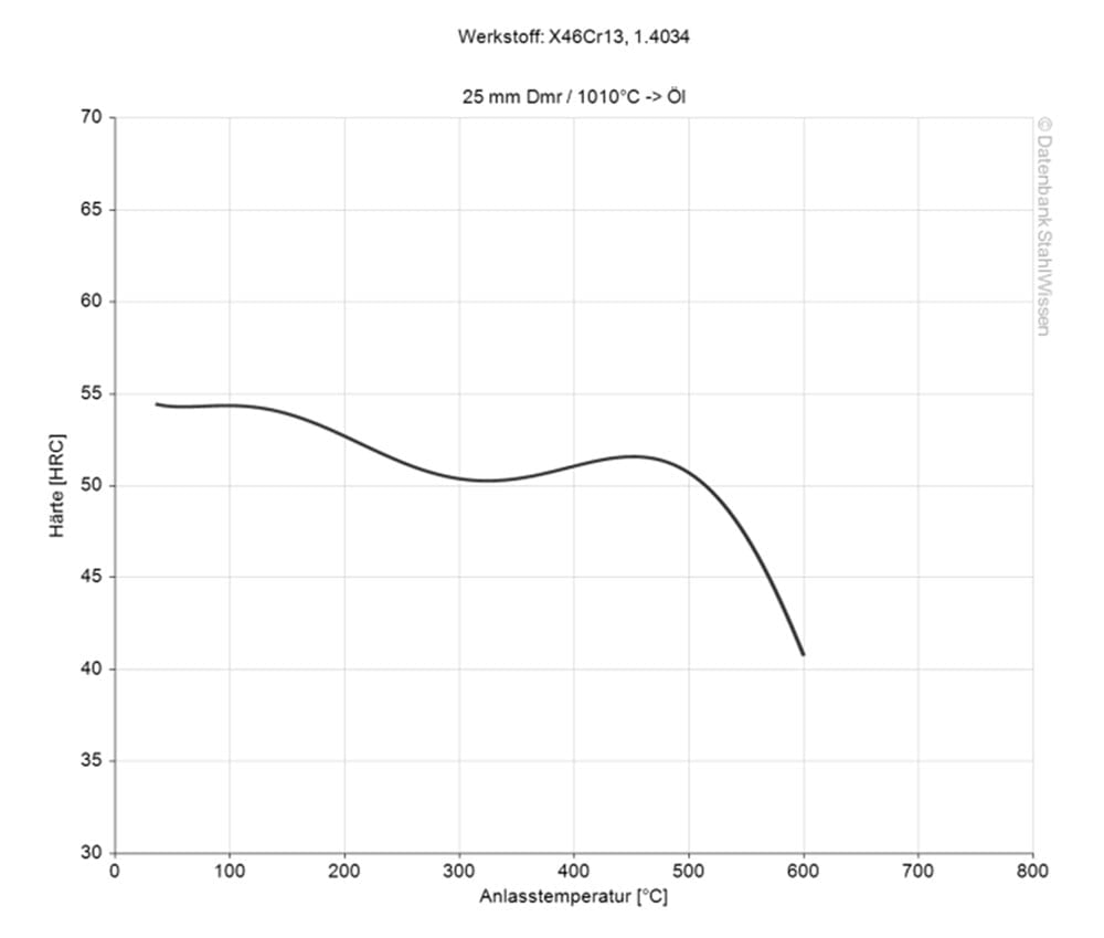 Stainless steel 1.4034 (X46Cr13) has, in its annealed condition, good ductility and can when hardened, reach a hardness of min. 50 HRC. As a martensitic stainless steel 1.4034 is optimized for its high hardness, while other properties are compromised to some degree. 1.4034 loses ductility at sub-zero temperatures and is in comparison to austenitic steels less corrosion resistant, has poor weldability and loses strength when over-tempered at elevated temperatures.