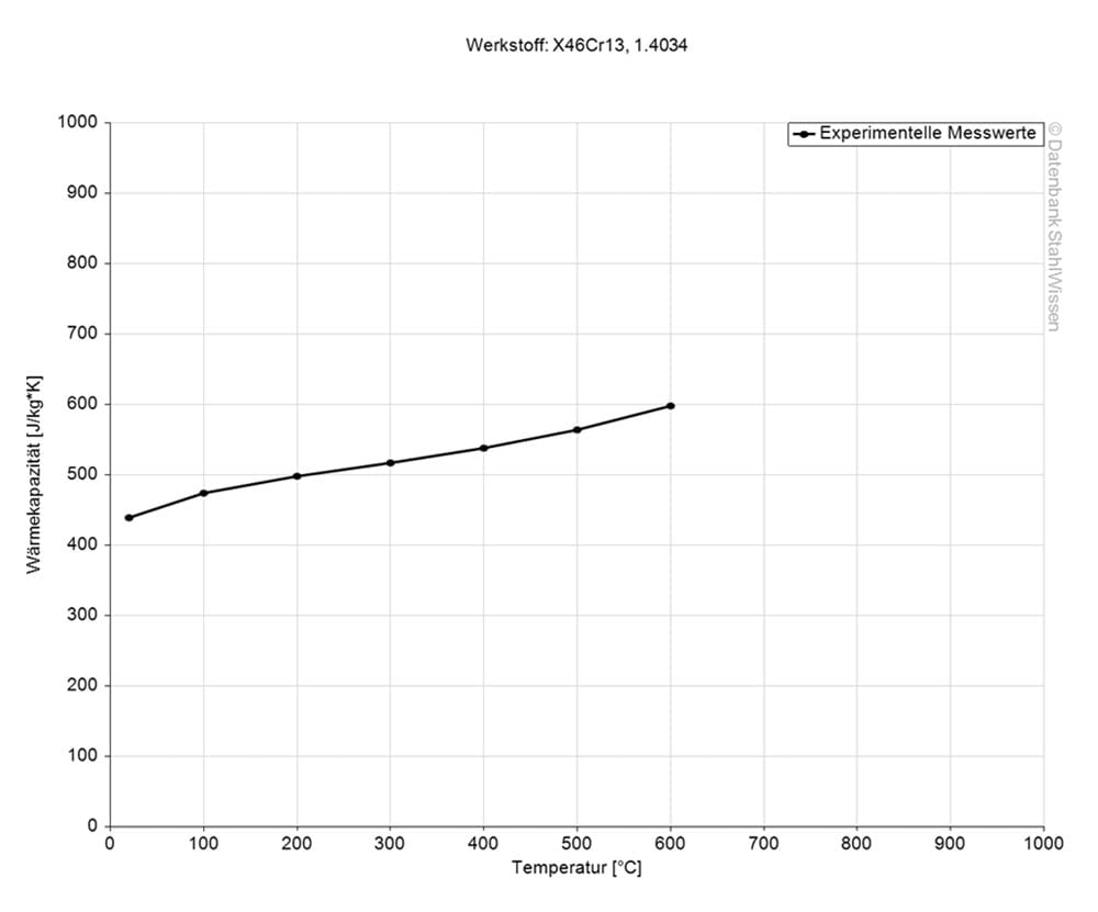 The specific heat capacity for stainless steel 1.4034 at room temperature is 0,46 J/kg*K. This value indicates how much heat is required to heat a certain amount of material by 1 Kelvin.
