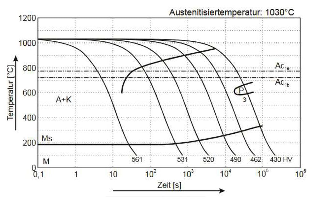 This diagram shows micro-changes over time at different temperatures. These are important in heat treatment because they provide information about the optimal conditions for processes such as hardening, annealing and normalising.