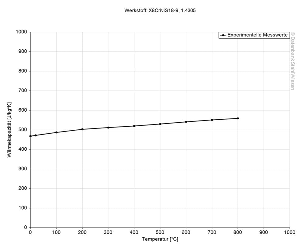 The specific heat capacity for stainless steel 1.4305 at room temperature is 0,5 J/kg*K. This value indicates how much heat is required to heat a certain amount of material by 1 Kelvin.