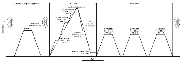 After the initial rough work the workpiece should be stress relieved. For that it is heated to a temperature of 600 – 650 °C and held for 2 hours and then cooled down slowly. Then the workpiece can be finished.