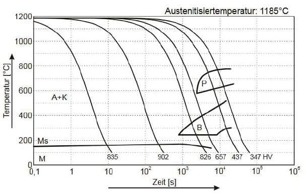 This diagram shows micro-changes over time at different temperatures. These are important in heat treatment, as they provide information about the optimal conditions for processes such as hardening, annealing and normalising.