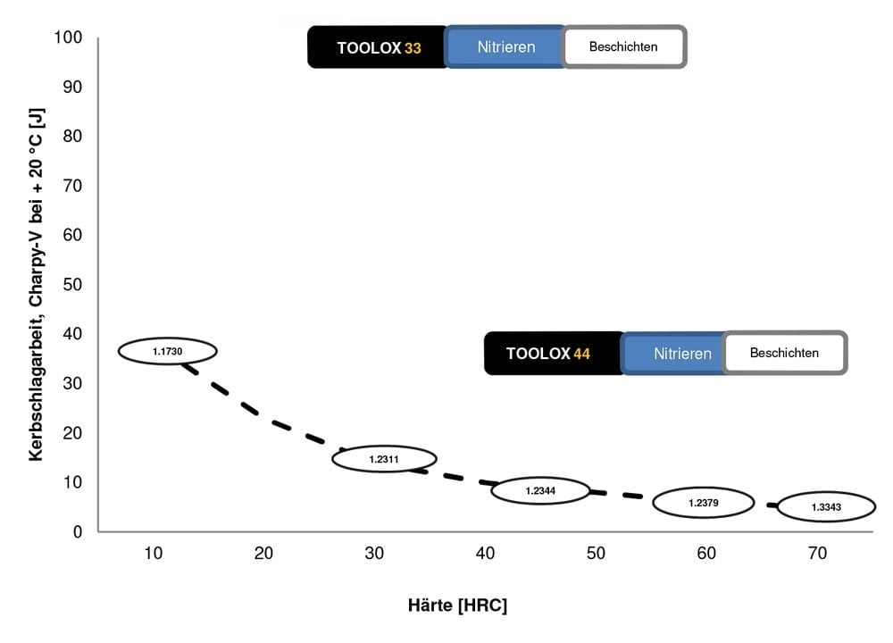 The working hardness for Toolox 44, in the delivery condition and without nitriding, is 45 HRC.
